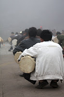 the next day begins sometime after sunrise, but still well before noon. we decide to move from our guesthouse to a nearby hotel. the exact reason, we are unsure of. maybe the room was a little dingy and uninspired, although the family was very nice and hospitable and helpful. maybe it was the shower that hovered over the squat toilet instead of the usual beside it? either way, we moved to a newer hotel that was right off of titian square. meet up with ron and eileen to discuss the plans for the day. outside is dense fog. hard to see much at all. we are lucky to have decided to not venture out for sunrise. will there be an opportunity for sunset? we'll decide later. somewhat disappointed at the lost photo opportunity because of the weather, but its an opportunity to explore something new. shooting in the fog. we wander the small streets of xinjie town in yuanyang. much is alive here. such spirit and energy. a colourful history. back in titian square the hani and yi women are rehearsing their immense performance again. singing and dancing. the square is as dense with people as it is with fog! this time we find someone to ask what its all about. they have a big local celebration each year near the end of the year 'yuanyang night', in which the women and men from the villages perform for each other and for the people from the town and villages. then they celebrate with a huge 'long street banquet'. its not meant to be a touristy thing at all. we feel extremely fortunate to be here to witness the rehearsals. unfortunately, we won't be here for the main performance. we stand and watch as they run through their performance. sing, dancing and playing a traditional string instrument in one group and another group practicing their fan dance and song. bright coloured traditional dress fill the foggy square with intense splashes of colour. there is no pulling ourself away from watching all of this. well, atleast until hunger sets in. time for lunch.